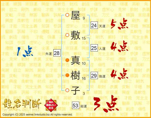 屋(9画)敷(15画) 真(10画)樹(16画)子(3画)