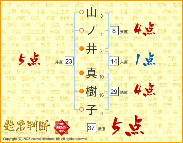 山(3画)ノ(1画)井(4画) 真(10画)樹(16画)子(3画)