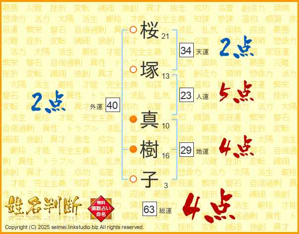 桜(21画)塚(13画) 真(10画)樹(16画)子(3画)