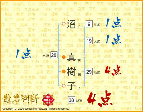 生活面を象徴する運勢です。外部から受ける影響力を表し、結婚運、家庭運や職場、環境への順応性を表します。総運から人運を引いた画数。姓や名が1文字の場合を除く。