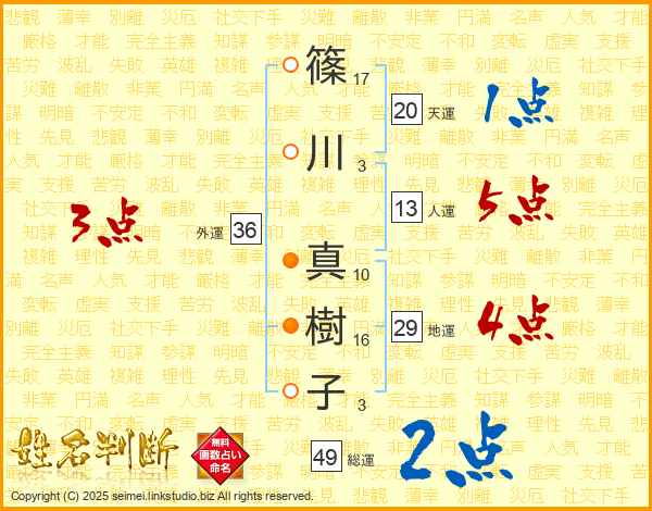 篠(17画)川(3画) 真(10画)樹(16画)子(3画)