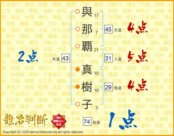與(17画)那(7画)覇(21画) 真(10画)樹(16画)子(3画)
