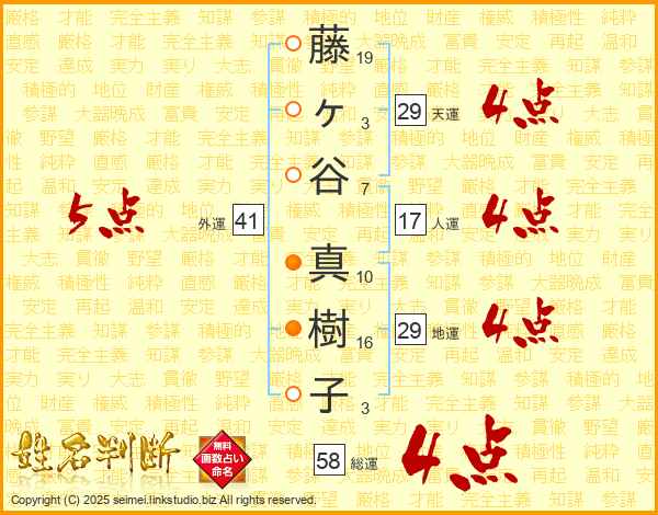 藤ヶ谷真樹子さんの総運は58画の4点!