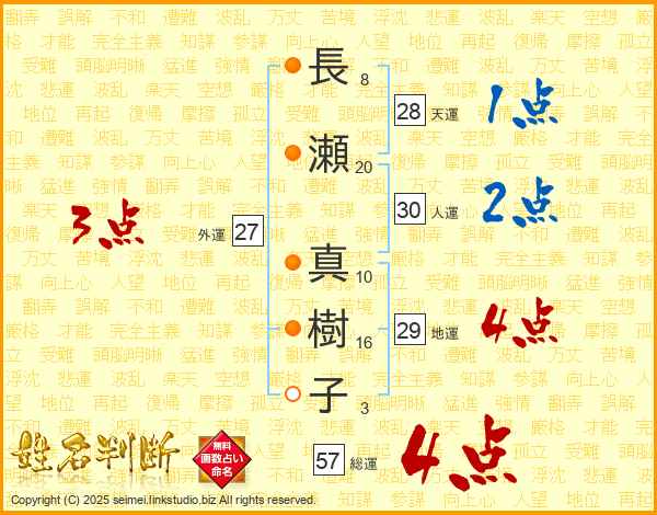 長(8画)瀬(20画) 真(10画)樹(16画)子(3画)