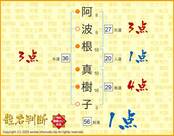 阿(8画)波(9画)根(10画) 真(10画)樹(16画)子(3画)