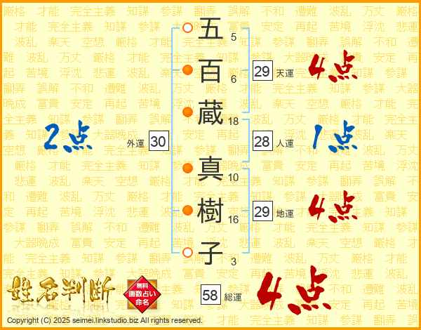 五(5画)百(6画)蔵(18画) 真(10画)樹(16画)子(3画)