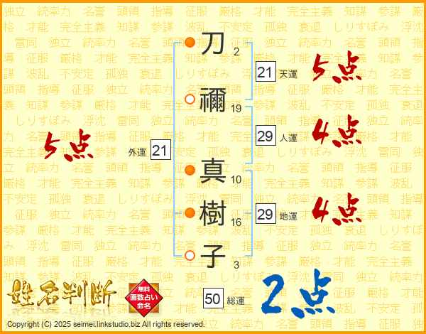 刀禰真樹子さんの総運は50画の2点!