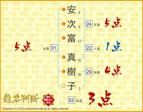 安(6画)次(6画)富(12画)  真(10画)樹(16画)子(3画)