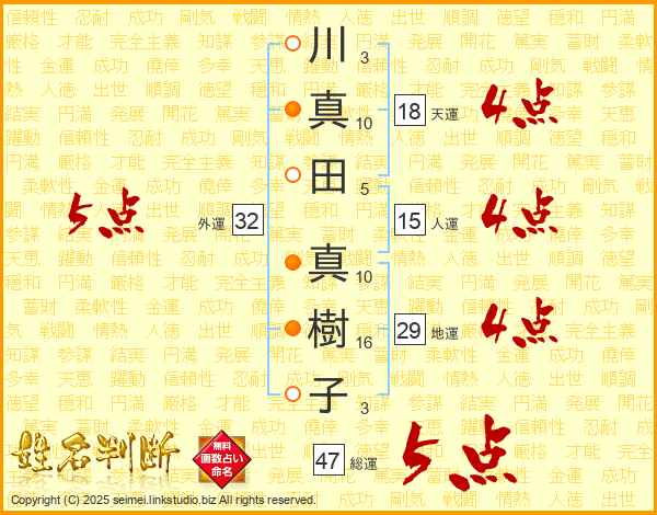 川(3画)真(10画)田(5画) 真(10画)樹(16画)子(3画)