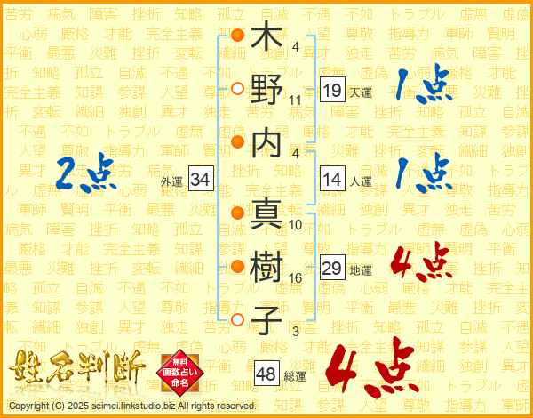 木(4画)野(11画)内(4画) 真(10画)樹(16画)子(3画)