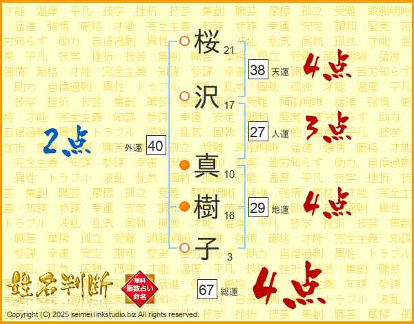 桜(21画)沢(17画)  真(10画)樹(16画)子(3画)