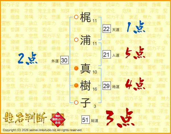 梶(11画)浦(11画) 真(10画)樹(16画)子(3画)