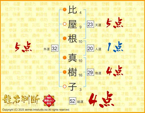 比(4画)屋(9画)根(10画) 真(10画)樹(16画)子(3画)