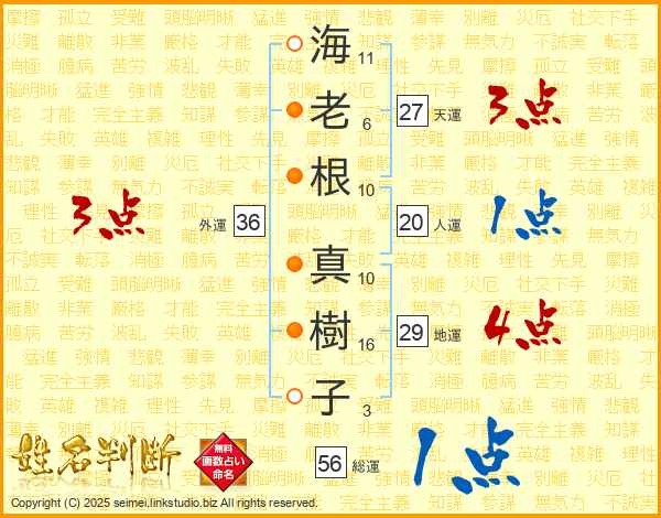 海(11画)老(6画)根(10画) 真(10画)樹(16画)子(3画)