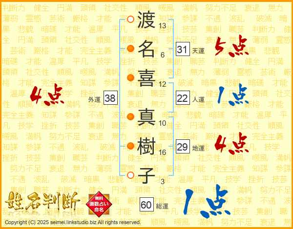 渡(13画)名(6画)喜(12画) 真(10画)樹(16画)子(3画)
