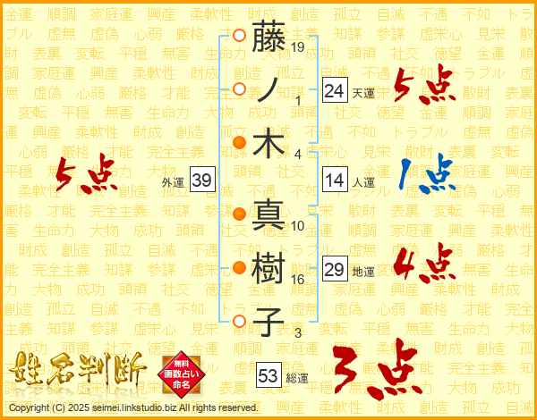 藤(19画)ノ(1画)木(4画) 真(10画)樹(16画)子(3画)