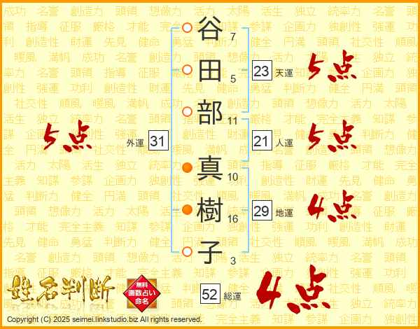 谷(7画)田(5画)部(11画) 真(10画)樹(16画)子(3画)