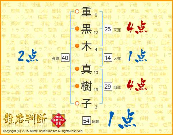 重(9画)黒(12画)木(4画) 真(10画)樹(16画)子(3画)