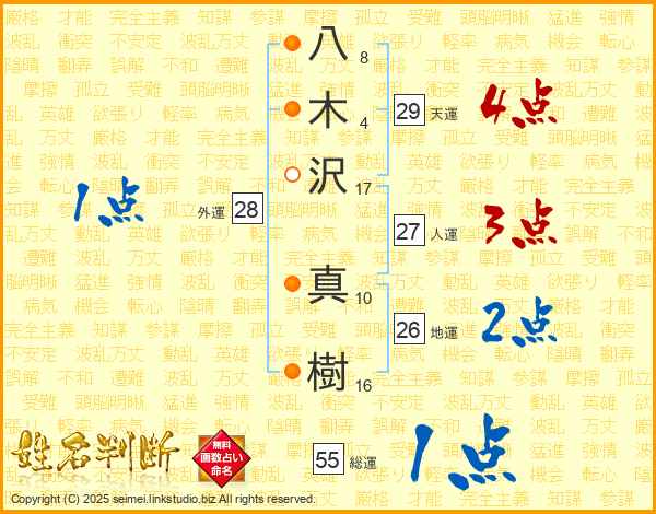 八(8画)木(4画)沢(17画) 真(10画)樹(16画)