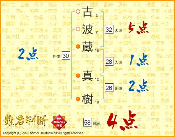 古(5画)波(9画)蔵(18画)  真(10画)樹(16画)