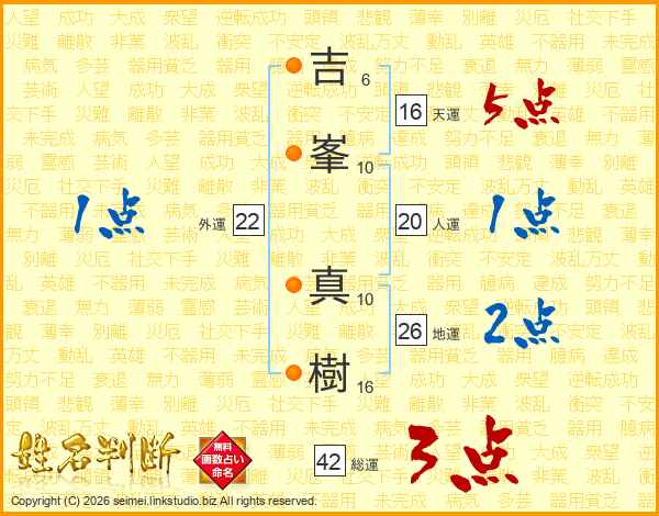 吉(6画)峯(10画) 真(10画)樹(16画)