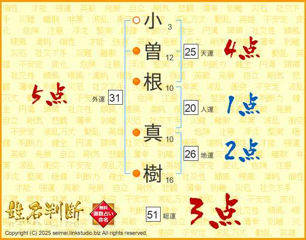 小(3画)曽(12画)根(10画) 真(10画)樹(16画)