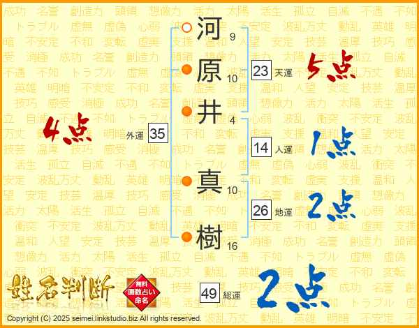 河(9画)原(10画)井(4画) 真(10画)樹(16画)