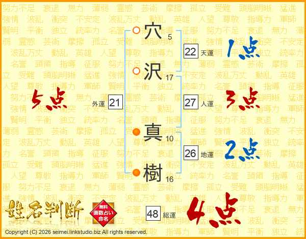 穴(5画)沢(17画) 真(10画)樹(16画)