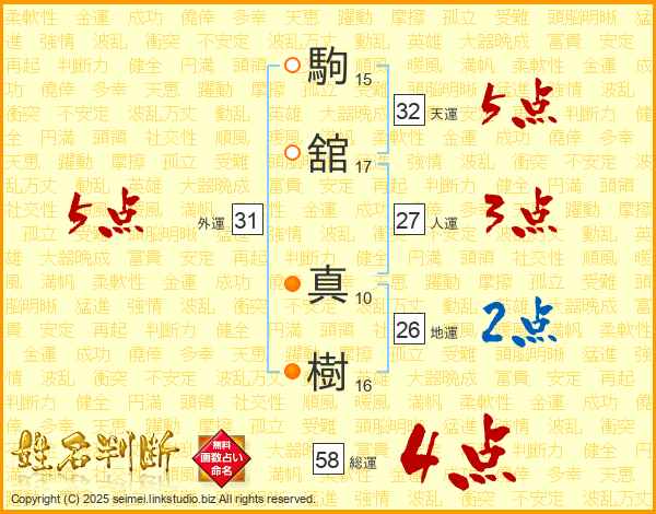 駒(15画)舘(17画) 真(10画)樹(16画)