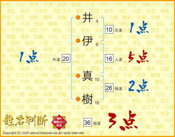 あなたの人生を表す1番重要な運勢です。生涯を通じて影響する総合運となり、主に50歳以降の晩年期に影響を及ぼします。苗字と名前の合計画数。