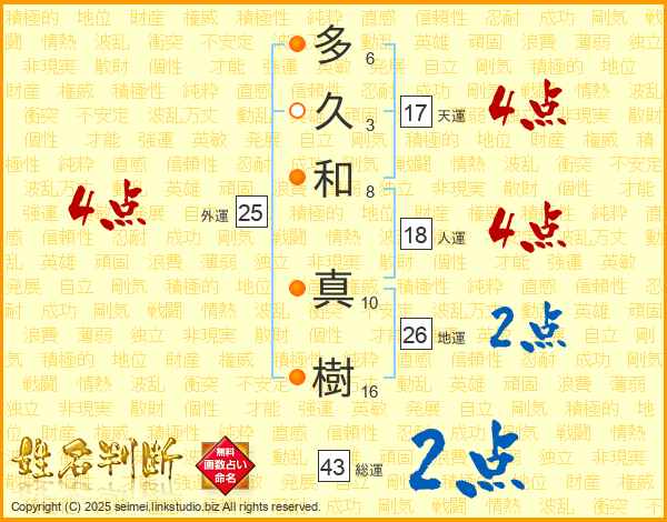 多(6画)久(3画)和(8画) 真(10画)樹(16画)