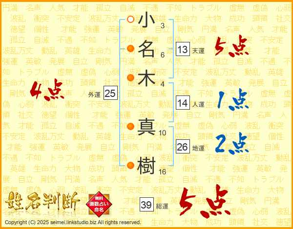 小(3画)名(6画)木(4画)  真(10画)樹(16画)
