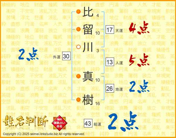 比(4画)留(10画)川(3画) 真(10画)樹(16画)