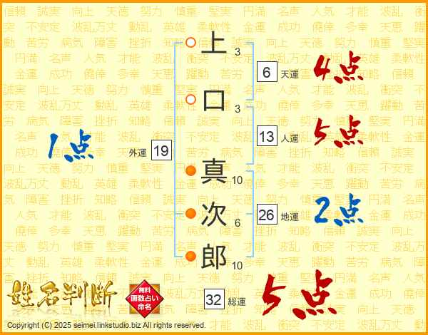 上(3画)口(3画) 真(10画)次(6画)郎(10画)