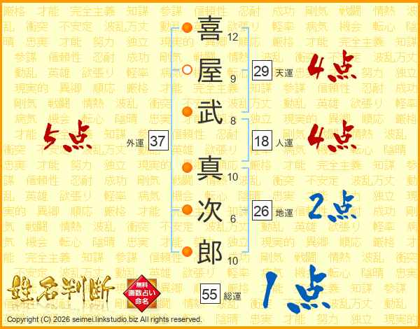 喜(12画)屋(9画)武(8画) 真(10画)次(6画)郎(10画)