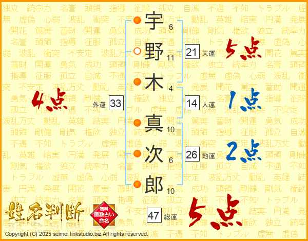 宇(6画)野(11画)木(4画) 真(10画)次(6画)郎(10画)