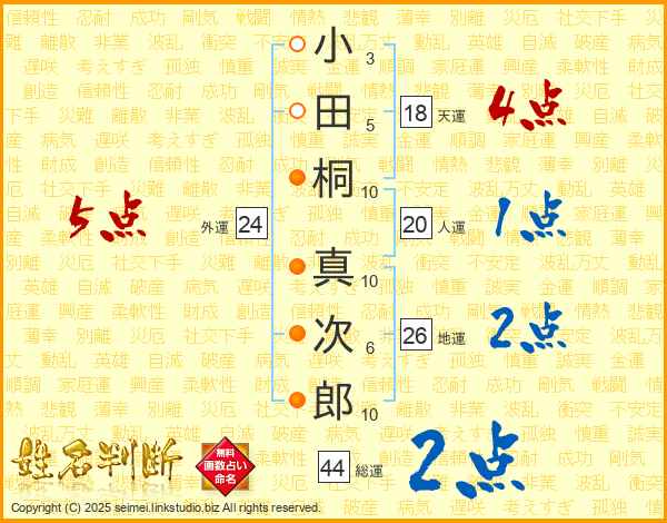 小(3画)田(5画)桐(10画) 真(10画)次(6画)郎(10画)