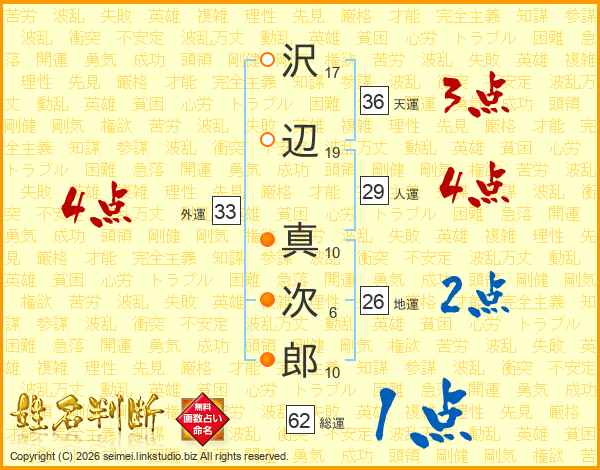 沢(17画)辺(19画) 真(10画)次(6画)郎(10画)