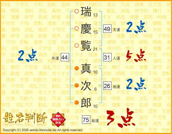 瑞(13画)慶(15画)覧(21画) 真(10画)次(6画)郎(10画)