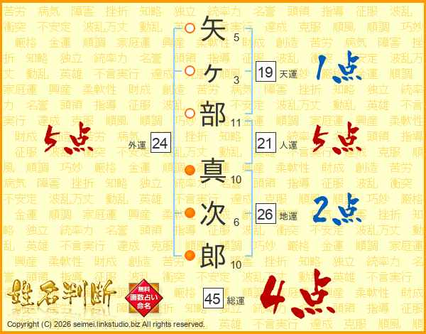 矢ヶ部真次郎さんの総運は45画の4点!
