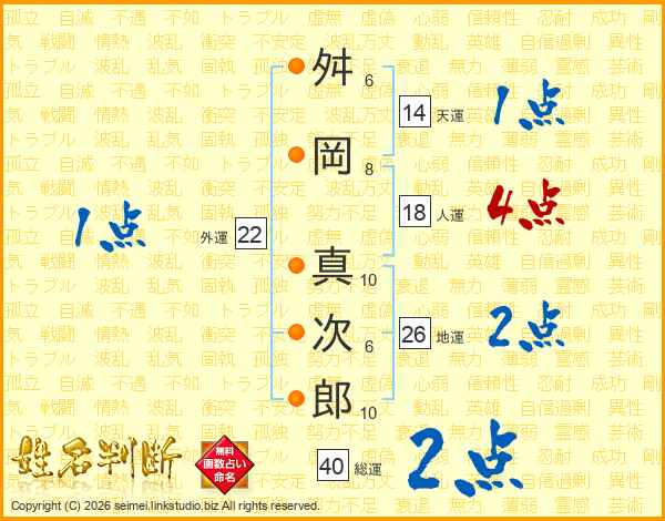 舛(6画)岡(8画) 真(10画)次(6画)郎(10画)