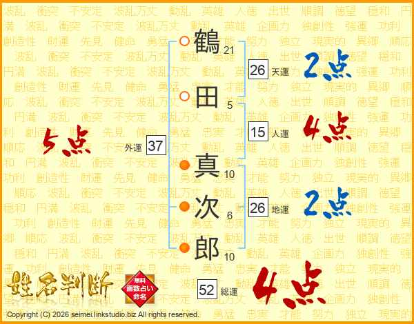 鶴田真次郎さんの総運は52画の4点!