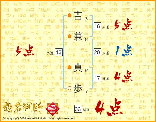 吉(6画)兼(10画) 真(10画)歩(7画)