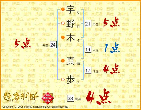 宇(6画)野(11画)木(4画) 真(10画)歩(7画)