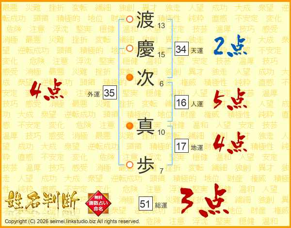 渡(13画)慶(15画)次(6画) 真(10画)歩(7画)