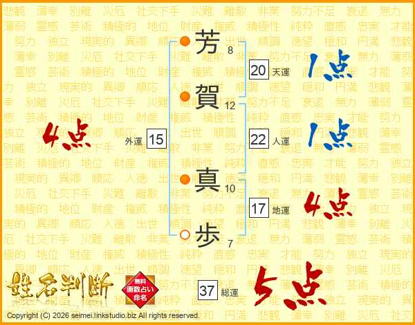 芳(8画)賀(12画) 真(10画)歩(7画)