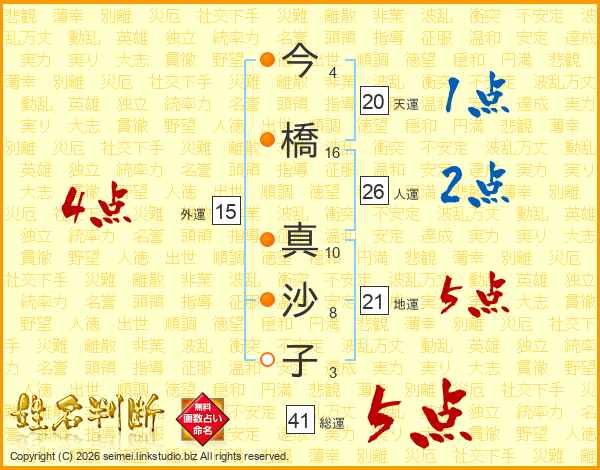 今(4画)橋(16画) 真(10画)沙(8画)子(3画)