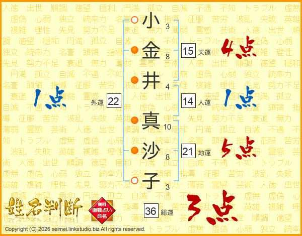小(3画)金(8画)井(4画) 真(10画)沙(8画)子(3画)