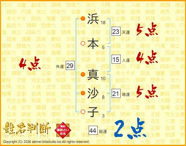 浜(18画)本(5画) 真(10画)沙(8画)子(3画)