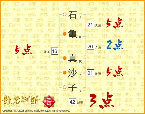 石(5画)亀(16画) 真(10画)沙(8画)子(3画)